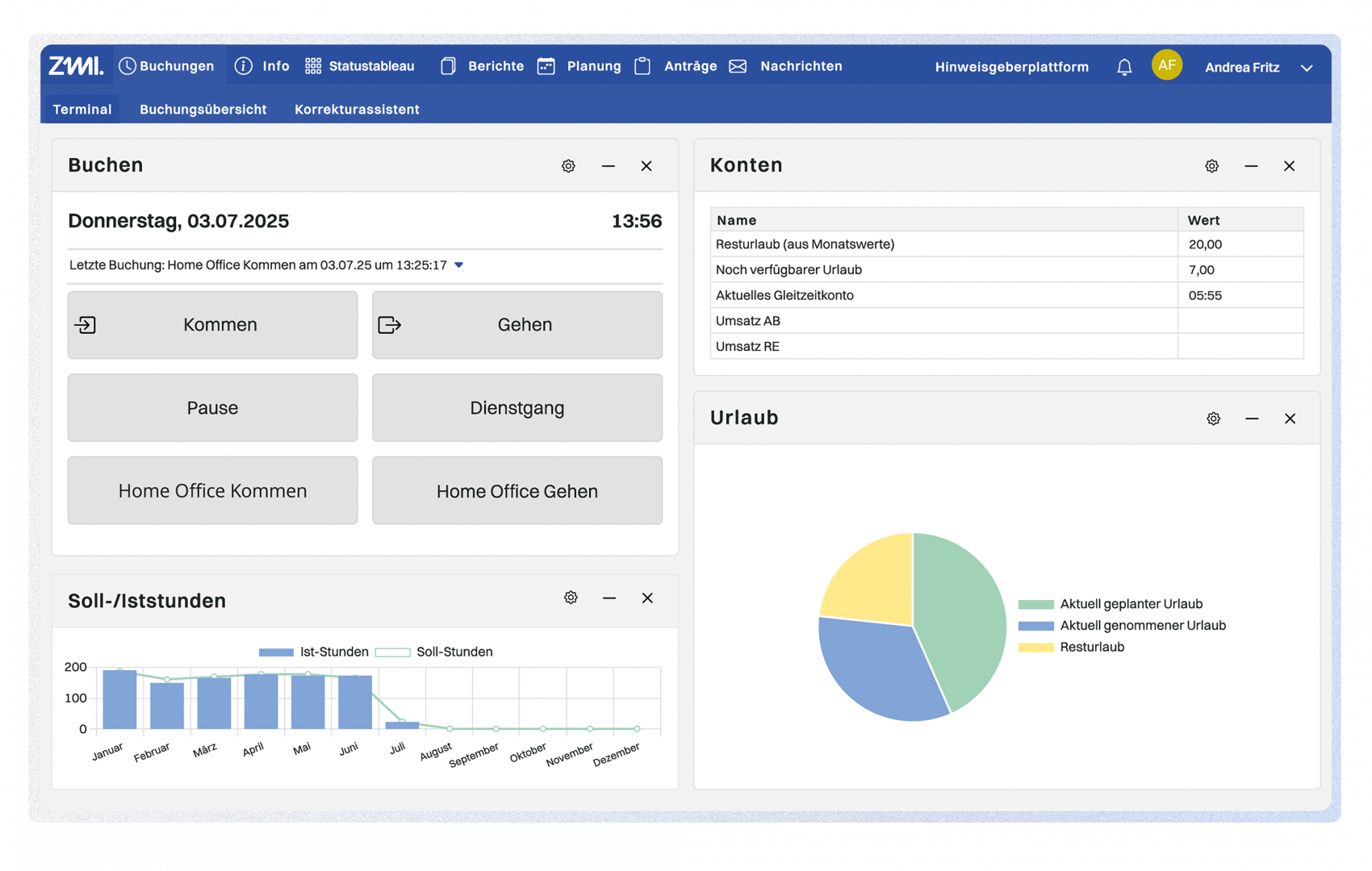 Digitalisieren und mobilisieren Sie Ihre HR-Prozesse wie beispielsweise Urlaubs- und Gleitzeitanträge, automatisieren Sie die Bewertung Ihrer Arbeitszeiten und übergeben Sie diese direkt in Ihre Lohnabrechnung.
